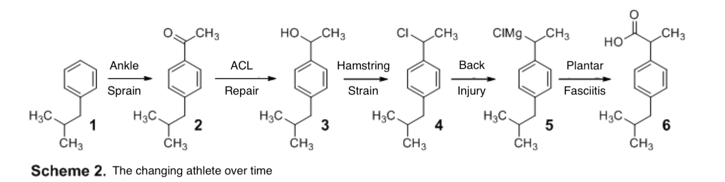 Now, let's transpose this complexity onto the world of running. Imagine yourself as an organic chemistry problem, where each reaction represents an injury sustained along the way. Picture the first substrate as your younger self, devoid of any major injuries. The first reaction occurs when you experience your initial significant injury, perhaps an ankle sprain. Though you eventually recover, you're not quite the same as before, transitioning to the next stage. The subsequent injuries—a torn ACL, followed by a hamstring strain on the same side, then a back injury, and finally, a yearlong battle with plantar fasciitis—culminate in your current state.